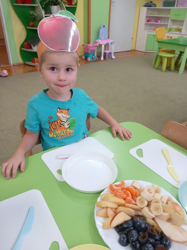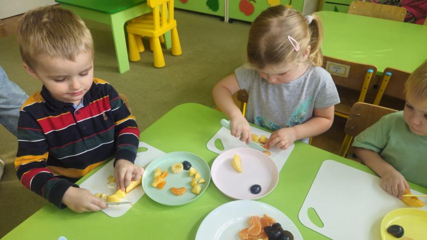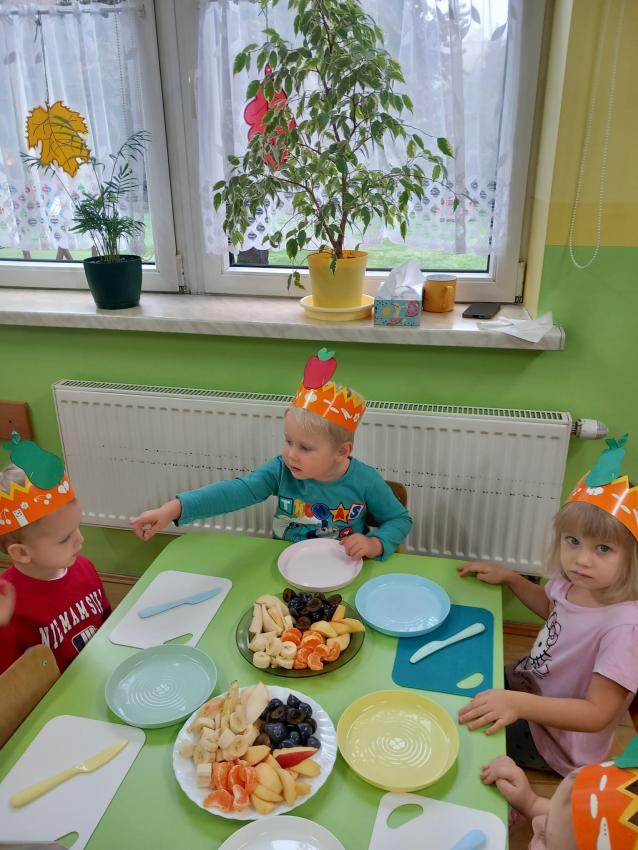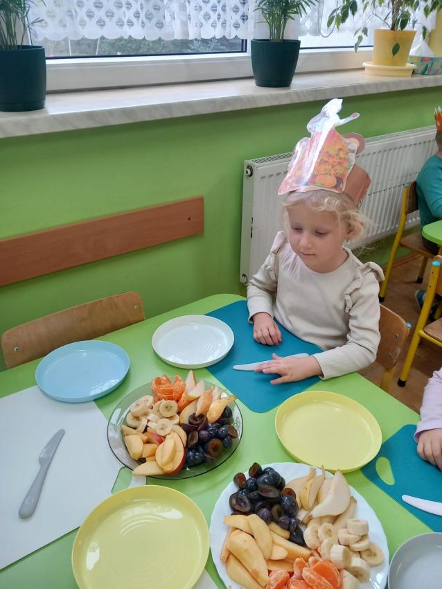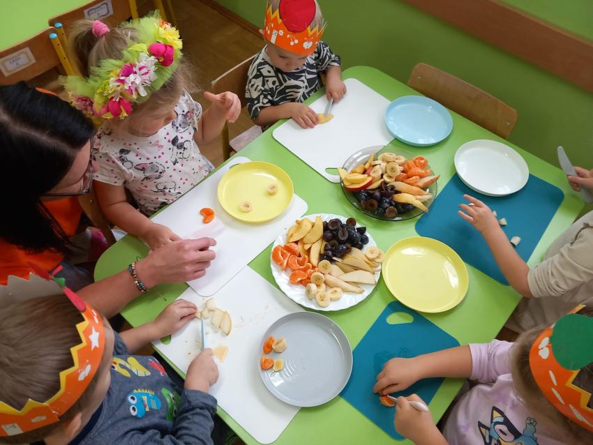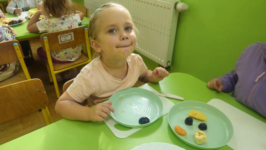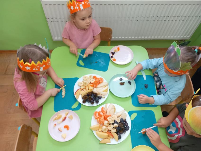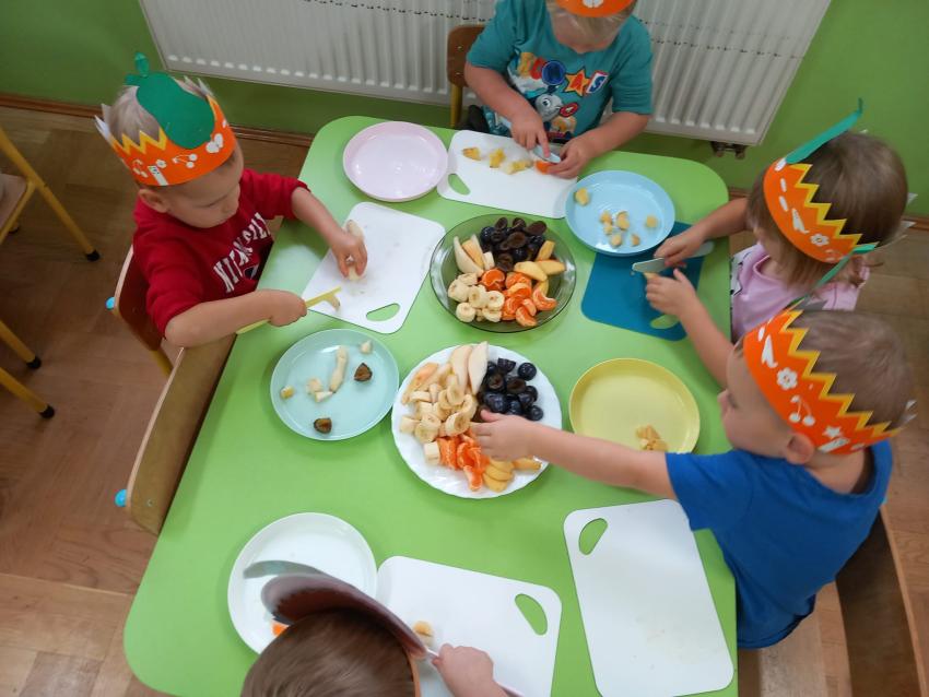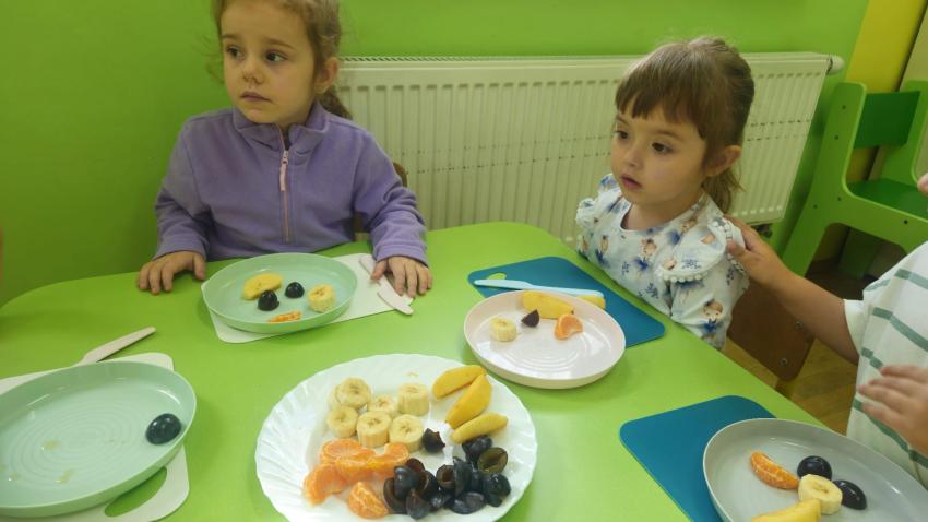 "Mali kucharze" z najmłodszej grupy, po zabawach ,w których rozpoznawały owoce po smaku i wyglądzie ,przygotowały ulubione przysmaki owocowe na talerzu.