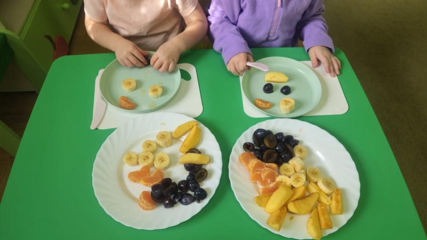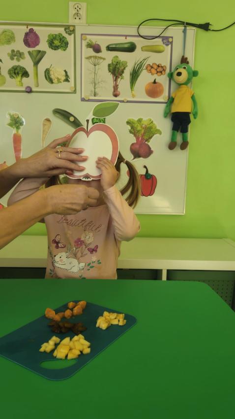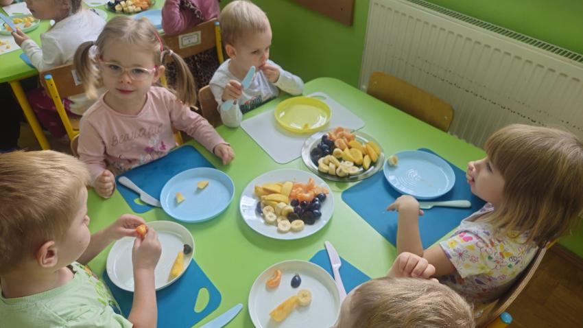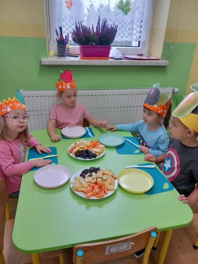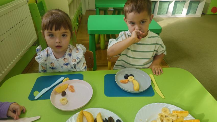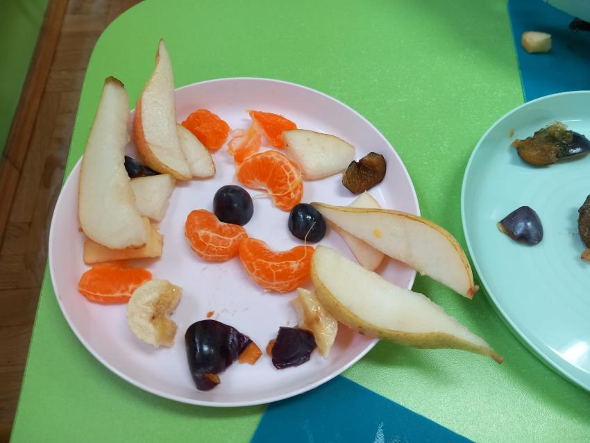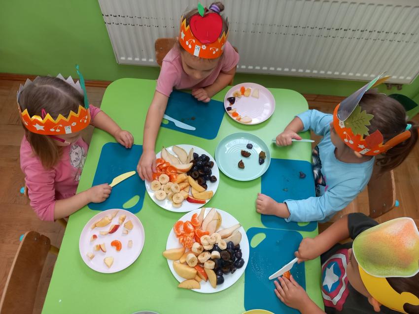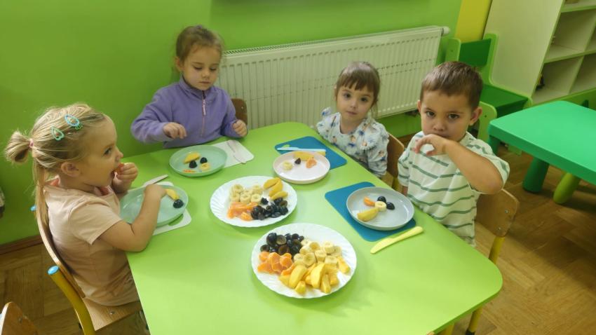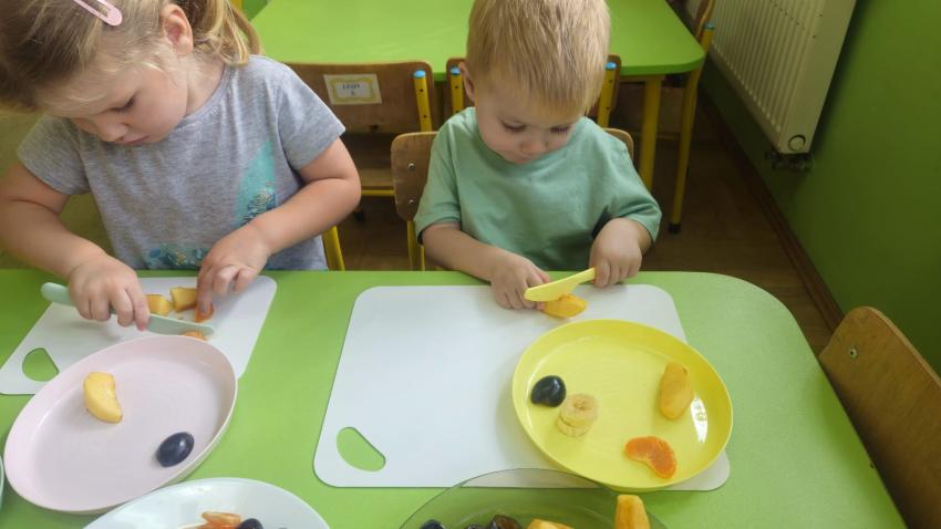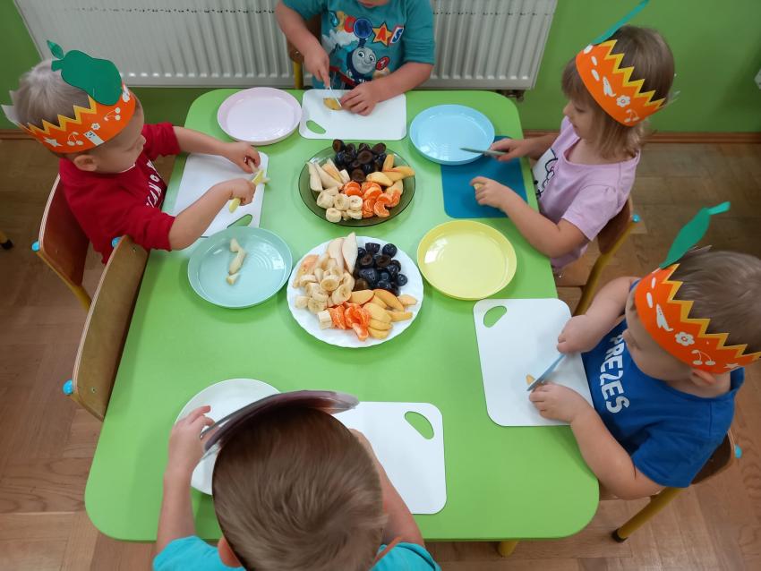 "Mali kucharze" z najmłodszej grupy, po zabawach ,w których rozpoznawały owoce po smaku i wyglądzie ,przygotowały ulubione przysmaki owocowe na talerzu.
