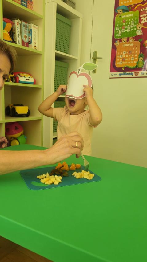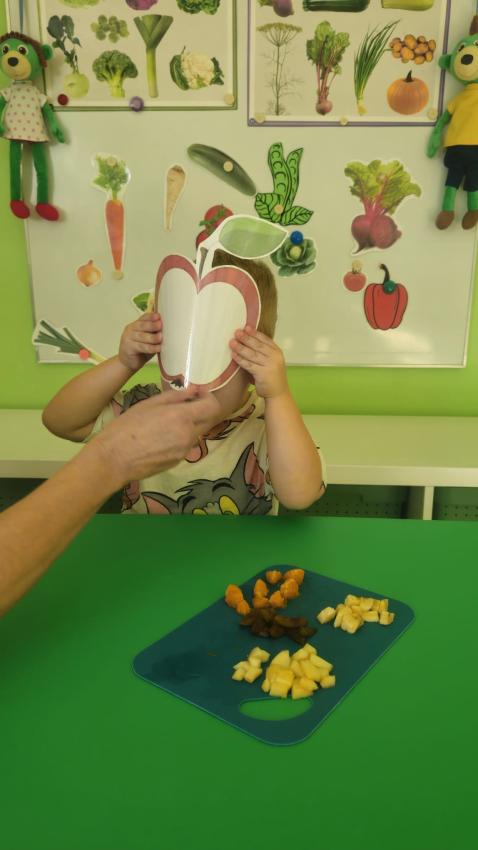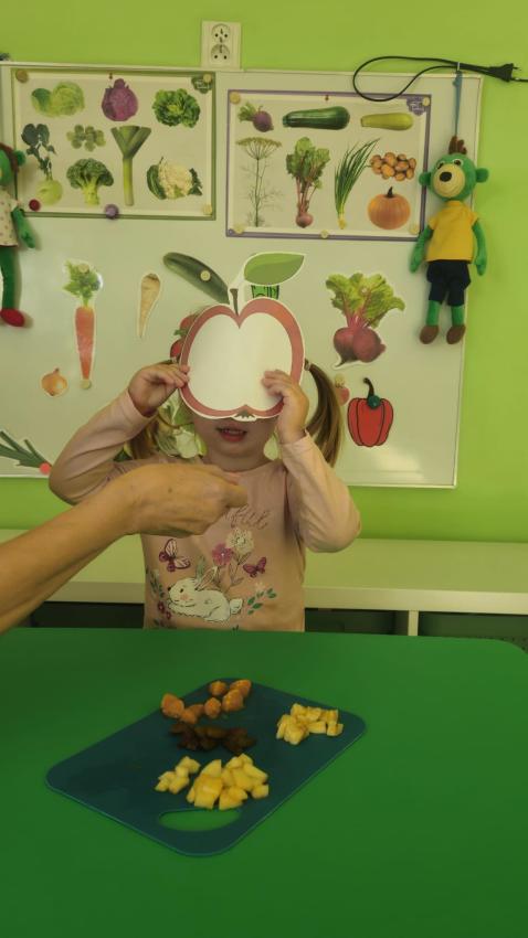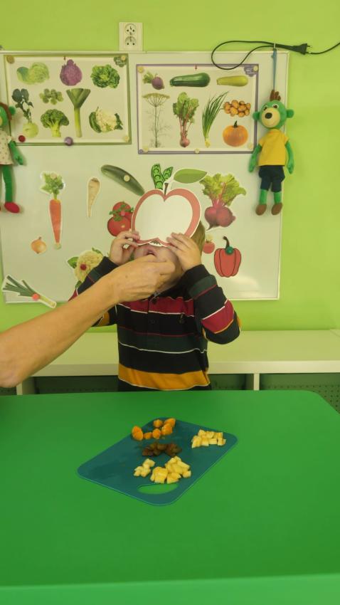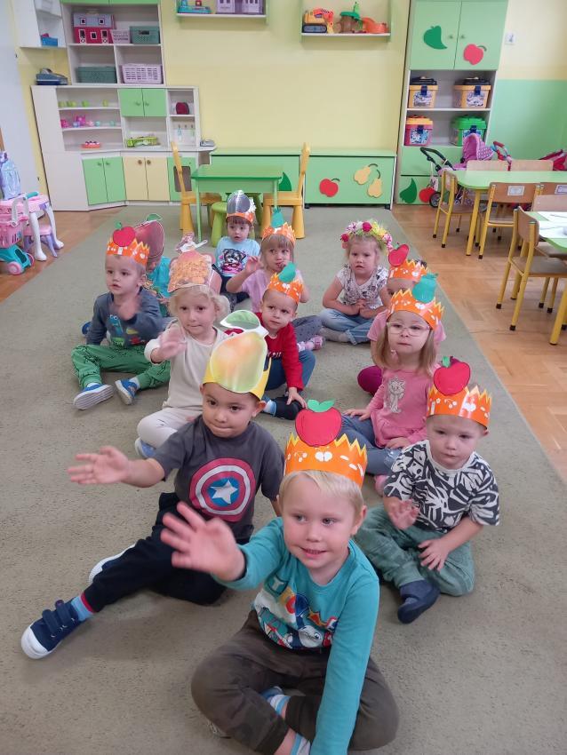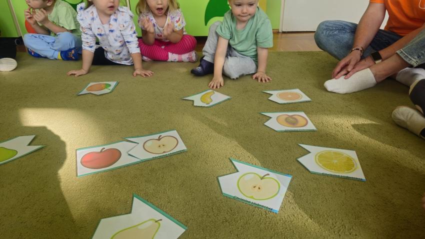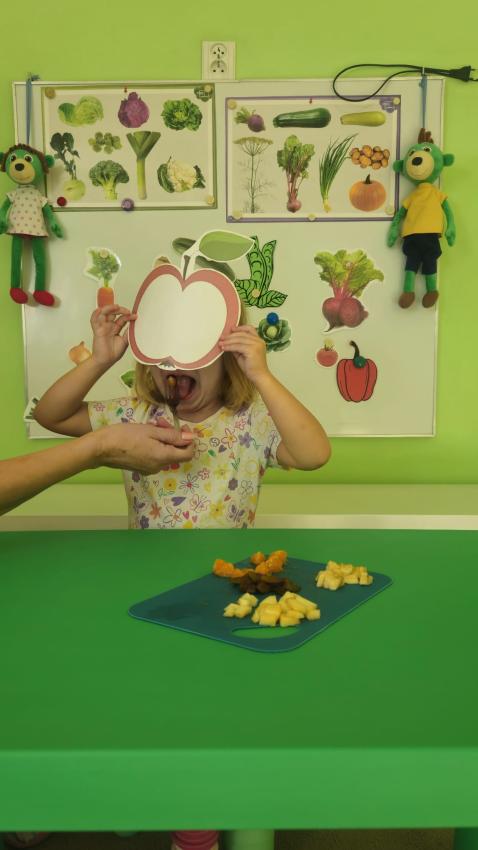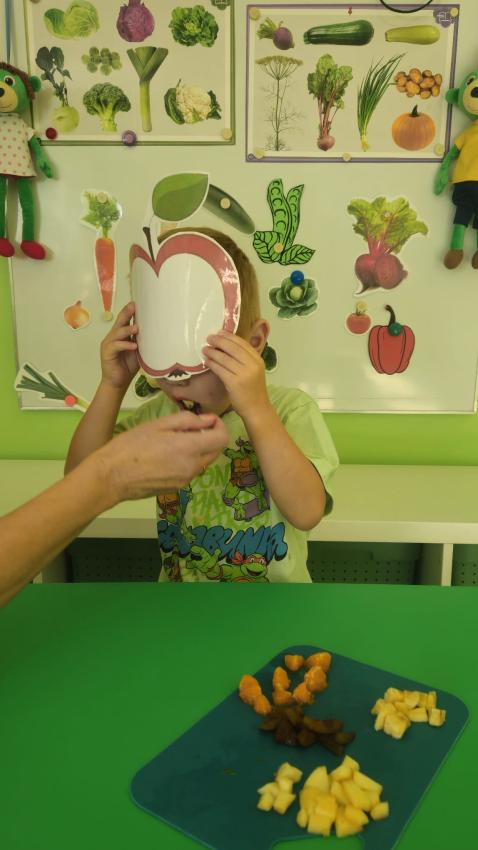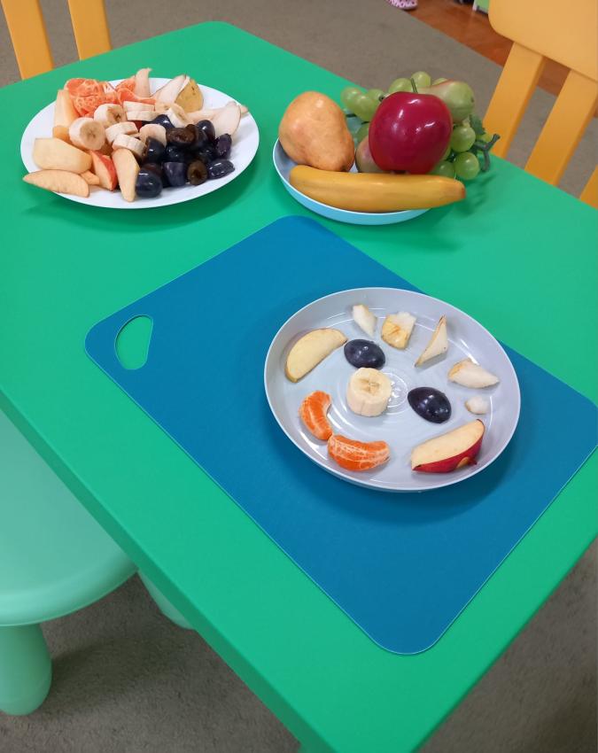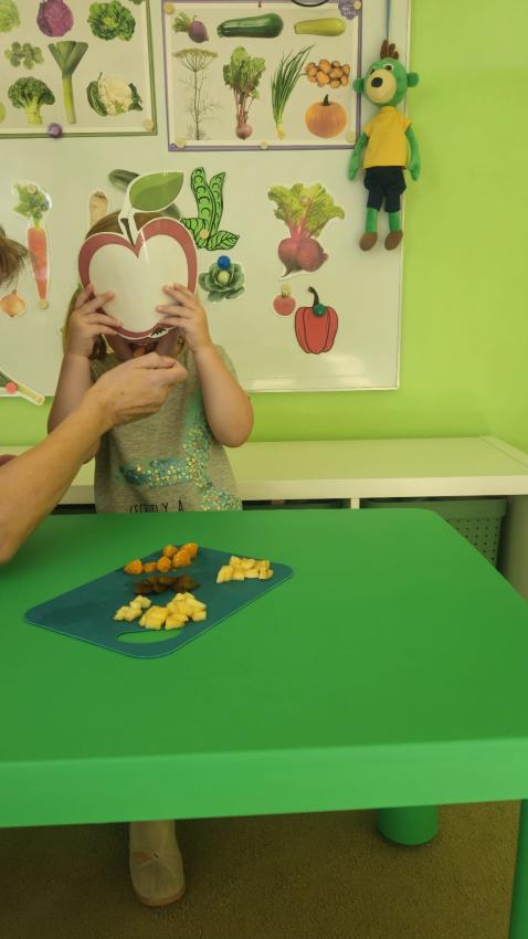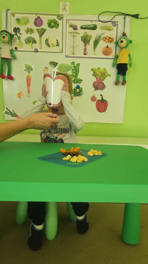 "Mali kucharze" z najmłodszej grupy, po zabawach ,w których rozpoznawały owoce po smaku i wyglądzie ,przygotowały ulubione przysmaki owocowe na talerzu.