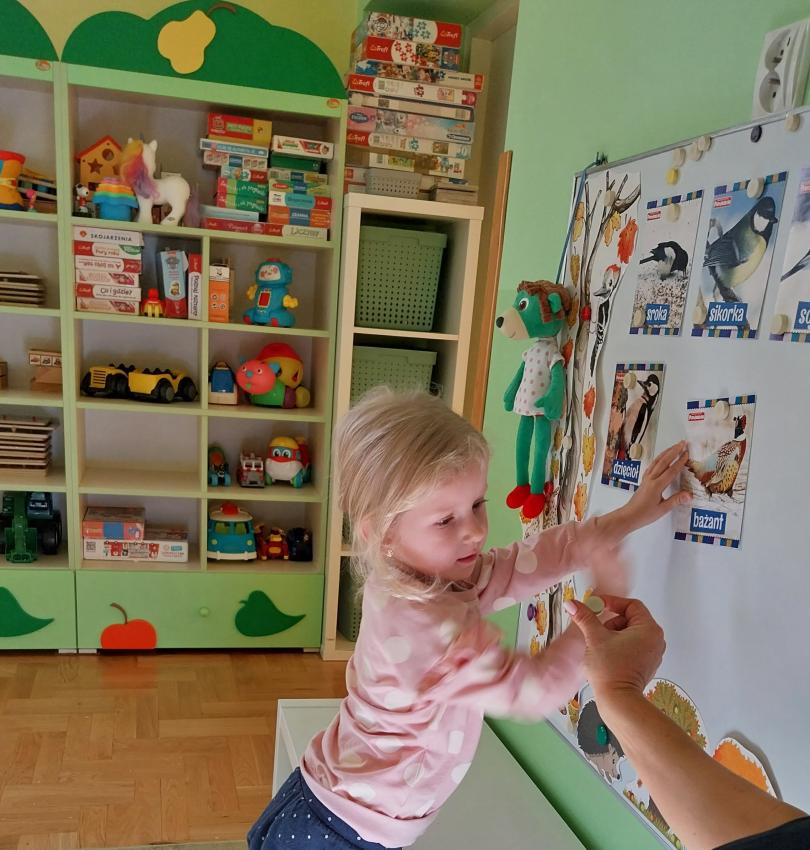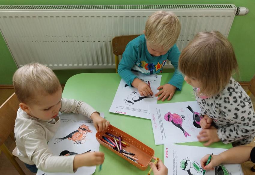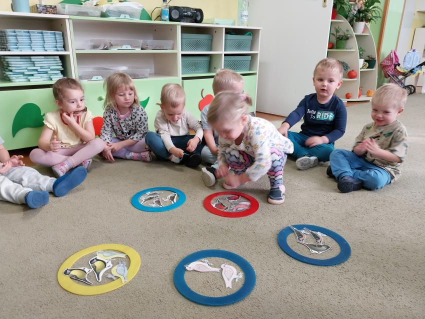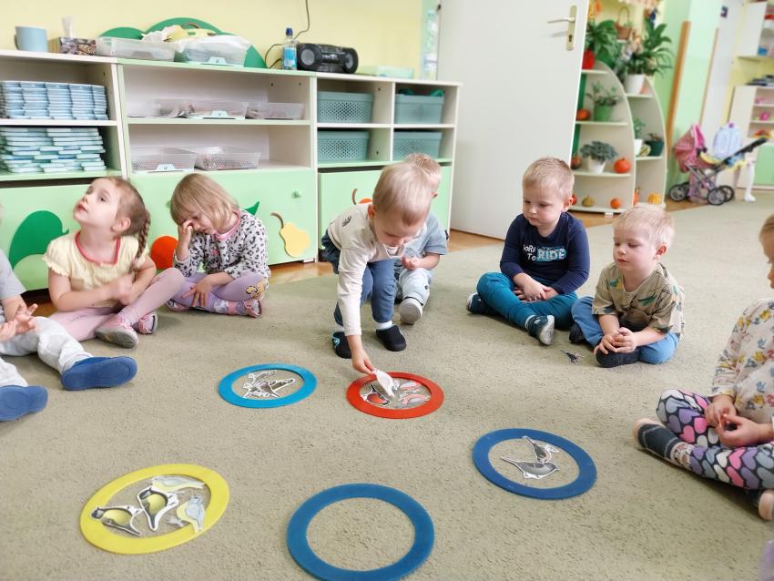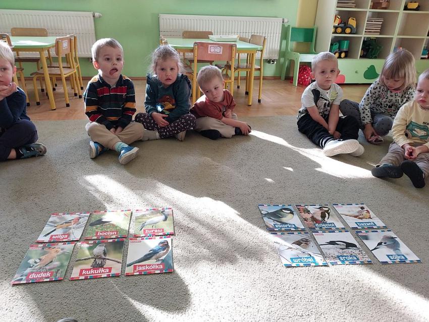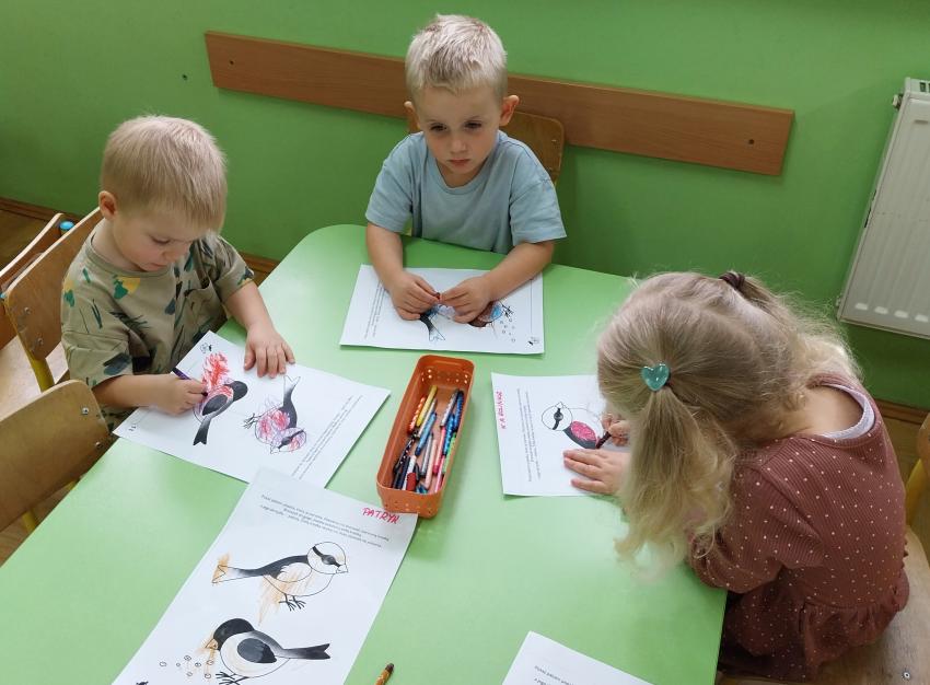 Najmłodsze przedszkolaki na jesiennych zajęciach zapoznawały się, w jaki sposób ptaki przygotowują się do zimy.