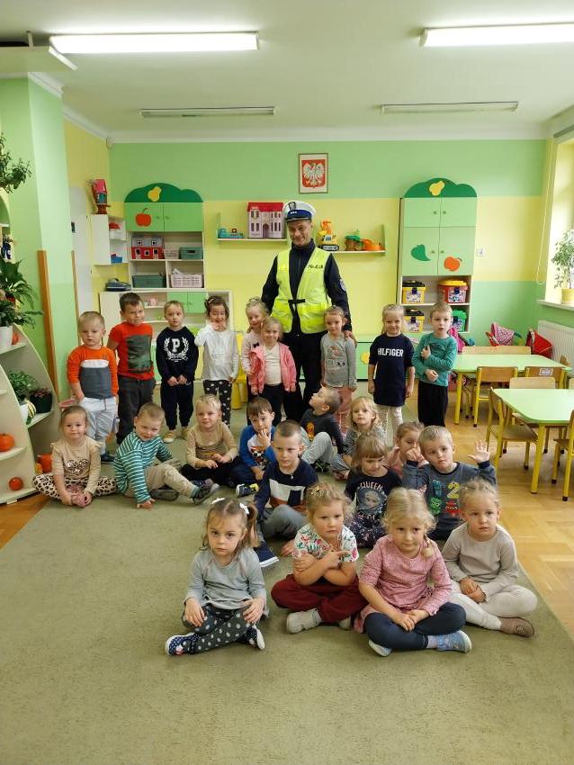 14 października w naszym przedszkolu gościliśmy pana policjanta.Podczas spotkania pan policjant przypomniał o podstawowych zasadach podczas przechodzenia przez ulicę i prawidłowym zachowaniu się w foteliku podczas jazdy samochodem. Następnie wytłumaczył jak należy zachować się w kontaktach z obcymi ludźmi, jak dbać o bezpieczeństwo własne i innych oraz do kogo zwracać się o pomoc w sytuacji zagrożenia. Dzieci z dużym zainteresowaniem słuchały rad i wskazówek zaproszonego gościa.